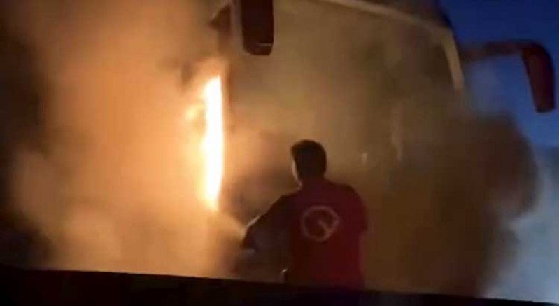 Kıcı mevkisinde, sürücüsünün kimliği henüz belirlenemeyen 58 TC 014 plakalı yolcu otobüsünün ön kısmında yangın çıktı.