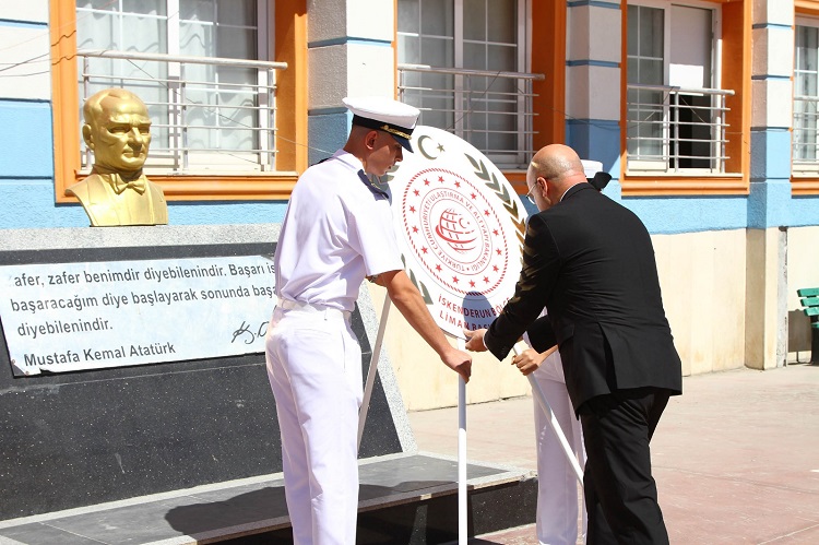 İskenderun Kaymakamlığı, İskenderun Liman Başkanlığı ve Deniz Ticaret Odası İskenderun Şubesi’nce düzenlenen tören Hanife Uysal Ortaokulu’nda Ata’nın huzuruna çelenk sunumuyla başladı.