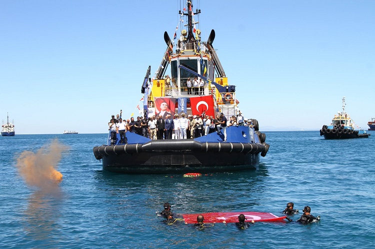 Sahil Güvenlik Komutanlığı’na ait botlar, deniz polisi, gemi ve teknelerin mavi sulardaki korteji ile İskenderun Polisi su altı dalış ekibinin mavu sularda Türk Bayrağı açmasının ardından program sona erdi.