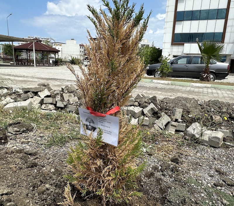 Öğrenciler, dikilen 200 fidanın üzerine plaketler çakarak depremde kaybettikleri arkadaşlarını andı.