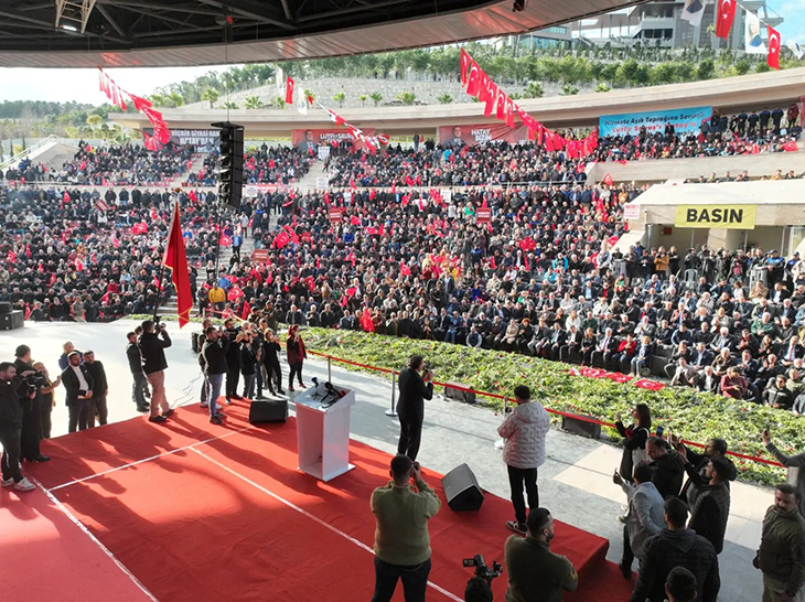 Başkan Savaş’ı HBB Yerleşkesi Antakya EXPO Alanı Amfi Tiyatroda karşılayan binlerce vatandaş ‘Bir Daha Lütfü Savaş’, ‘Hatay Lütfü Savaş’a Emanet’ sloganları, Türk bayrakları ve meşaleler ile karşıladı.