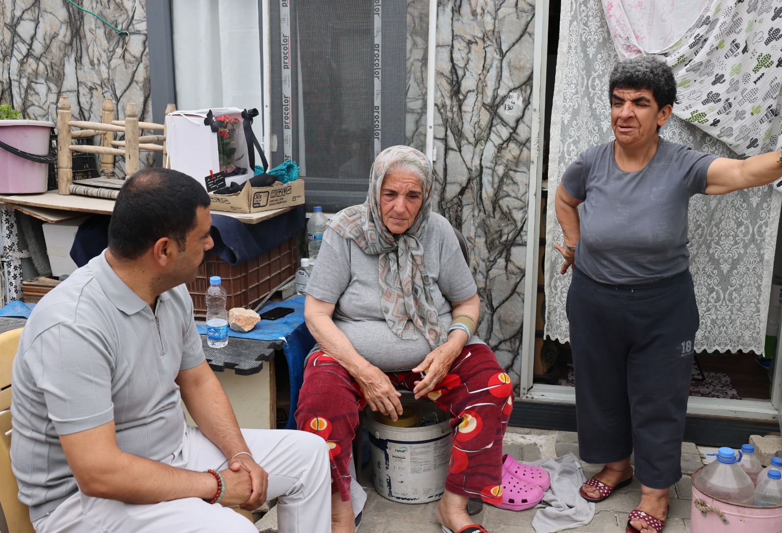 Büyükdalyan 1 Konteyner Kentte zorlu yaşam koşullarına rağmen çocuklarına sevgiyle kol kanat geren Süheyla Teyze’nin evinde HBB ekipleri hem moral verdi hem de destek mesajlarını iletti.