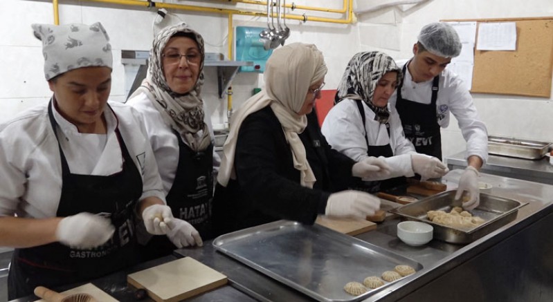 Emine Beder’e gastronomievi ziyaretinde Sanat Tarihçisi Zafer Yavuz da 13 medeniyet, 20 kültürden izler taşıyan Hatay mutfağına ait tescilli yemeklerin tarihi kökenine dair bilgiler verdi.