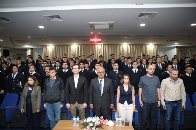 Saygı Duruşu ve İstiklal Marşı ile başlayan etkinlikte, Türkiye’nin ilk unlimited kadın Dinamik Pozisyon Operatörü (DPO) ve off-shore gemilerinde çalışan ilk Türk kadın zabiti olan Neslihan Müfreze, denizcilik kariyerine dair deneyimlerini öğrencilerle paylaştı.