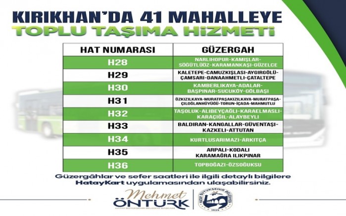 HBB, Kırıkhan’da 41 mahalleye toplu ulaşım imkanı sağlayan ve Hataykart elektronik ödeme sistemine entegre bir şekilde çalışan yeni hatlarla ilçede toplu ulaşımı rahatlattı.